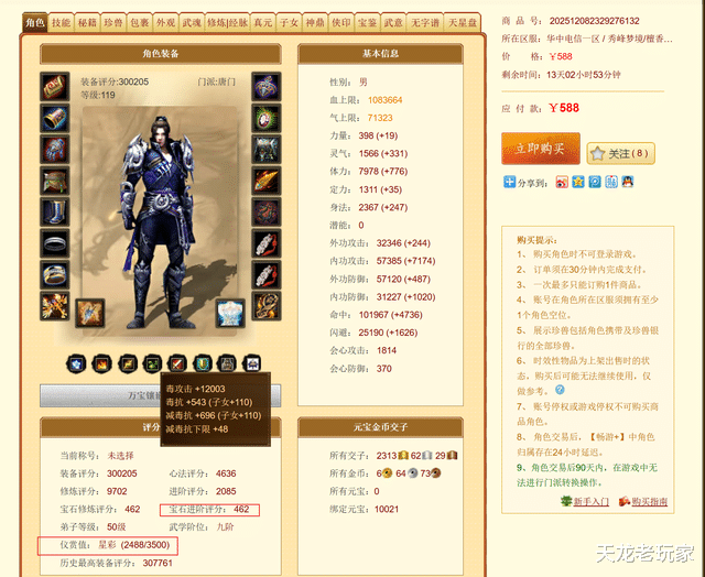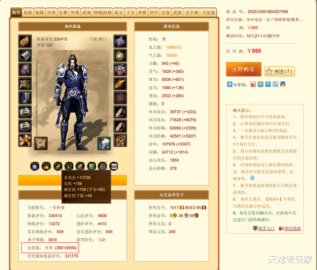 第一个是评分最高也是最贵的,33万评分888元,玄唐门,主要特色就是宝石上的比较齐,面板也有点优势,有件水墨京华时装,但是问题是玄唐门,而且号本身也没什么特色。