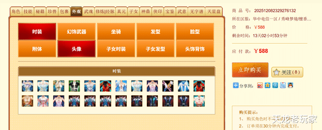 第二个是30万评分588元的毒唐门,这个号有件傲甲凌霜,时装也稍微多一点。